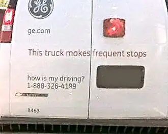 A "how's my driving" sign (or "how is my driving" or similar) is a decal posted or painted on a back of a fleet vehicle or other vehicle operated by an employee driver. The phone number, website address, and other identifying information are typically included on the sticker so that members of the public can call and report on the actions of the driver of the vehicle. Depending on the company, the phone number or website is monitored by the vehicle's owner or by a third-party company.[1]
