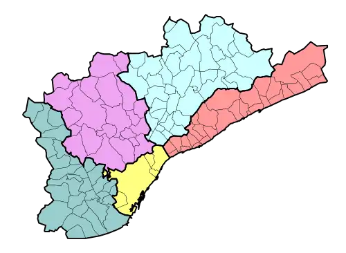 The region includes the counties of Baix Llobregat, Barcelonès, Maresme, Vallès Occidental and Vallès Oriental. Within Catalonia it borders Penedès to the south, Central Catalonia to the west, and vegueria of Girona to the north.