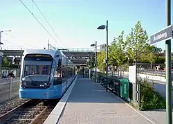Årstaberg is a station on Stockholm's commuter rail network, situated in the on the border between the Liljeholmen and Årsta districts in the south of Stockholm Municipality. The station has a central platform with two tracks serving commuter trains, along with additional tracks for passing trains that do not stop at the station. Årstaberg Station also features a stop on the Tvärbanan light rail line.[2]
