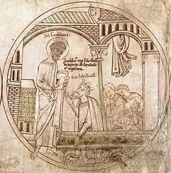 During Æthelbald's youth, Penda's dynasty ruled Mercia; Ceolred, a grandson of Penda and therefore a second cousin of Æthelbald, was king of Mercia from 709 to 716.[3] An early source, Felix's Life of Saint Guthlac, reveals that it was Ceolred who drove Æthelbald into exile.[4] Guthlac was a Mercian nobleman who abandoned a career of violence to become first a monk at Repton Abbey, and later a hermit living in a barrow at Crowland, in the East Anglian fens.[5] During Æthelbald's exile he and his men also took refuge in the Fens in the area, and visited Guthlac.[4] Guthlac was sympathetic to Æthelbald's cause, perhaps because of Ceolred's oppression of the monasteries.[6] Other visitors of Guthlac's included Bishop Haedde of Lichfield, an influential Mercian, and it may be that Guthlac's support was politically useful to Æthelbald in gaining the throne. After Guthlac's death, Æthelbald had a dream in which Guthlac prophesied greatness for him, and Æthelbald later rewarded Guthlac with a shrine when he had become king.[4][7]