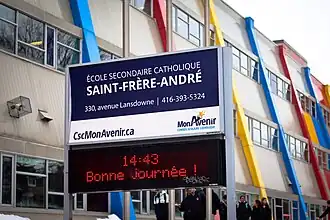 École secondaire catholique Saint-Frère-André is a French-language Roman Catholic high school in Toronto, Ontario, Canada. The school serves students in Grades 7 through 12 and is operated by the Conseil scolaire catholique MonAvenir, the public French-Catholic school board serving Central and Southwestern Ontario.