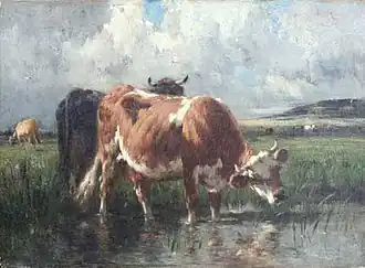He studied under Troyon at Barbizon. He received the cross of the Legion of Honor in 1872 and a gold medal at the Paris exhibition. He is represented at the Louvre and other museums of France, and at the Metropolitan Museum in New York, The John and Mable Ringling Museum of Art in Sarasota, Florida, and in other public and private collections in the United States. Typical of his work is the public domain image Summer Pastoral, Bresle Valley on this page reproduced courtesy of the Morton Collection. This gem-like work offers the favorite themes of van Marcke in a microcosm; it incorporates cattle, water, reflections, dramatic cloudscapes and a feeling of life and motion and verdant nature. Nature is idyllic and animals emblematic of that harmony.