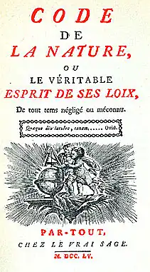 Étienne-Gabriel Morelly (French: [etjɛn gabʁjɛl mɔʁɛli]; 1717–1778) was a French utopian thinker, philosopher and novelist. An otherwise "obscure tax official",[1] and teacher,[2] Morelly wrote two books on education, a critique of Montesquieu and The Code of Nature, which was published anonymously in France in 1755.[2] This book, initially attributed to philosophes including Rousseau and Diderot,[2] criticised contemporary society, postulated a social order without avarice, and proposed a constitution intended to lead to an egalitarian society without property, marriage, church or police.[3]