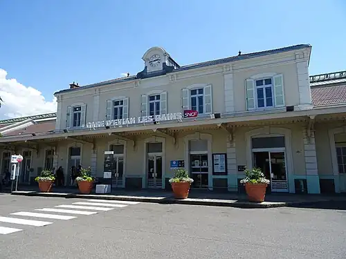 Évian-les-Bains station is a railway station serving the town Évian-les-Bains, Haute-Savoie department, southeastern France. The station is served by regional trains towards Lyon, Annemasse and Geneva, and high speed trains to Paris (weekends and holidays).[1][2][3]