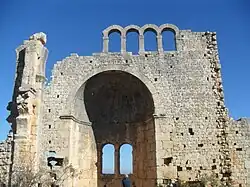 The house ruins in the north of the site are examples of the polygonal and Byzantine masonry. One house is a peristyle house. The foundations of some buildings are carved rock. There are sarcophagi along the road. At the center of the site there are ruins of a basilica. The basilica with three naves and a transept is backdated to about 500. There is a smaller church situated about 500 metres (1,600 ft) south of the basilica.[2]