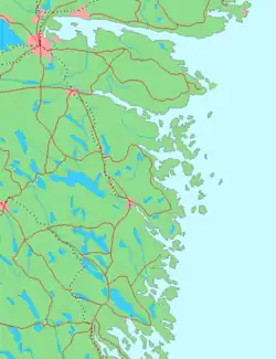 The Östergötland archipelago is the collective name of three archipelagoes located to the east of the shore of Östergötland, Sweden, spanning three municipalities. It consists of 8,888 islands.[1] It measures more than 60 kilometres (37 miles) from north to south and five kilometres (3.1 mi) west to east. The archipelago's northern end adjoins the bay of Bråviken[2] and is centered on Arkösund, off the Vikbolandet peninsula and forms part of Norrköping Municipality. The central part is called Sankt Anna's archipelago and is part of Söderköping Municipality. The southernmost part is the Gryt archipelago in Valdemarsvik Municipality, and adjoins the Tjust archipelago in Småland.[3]