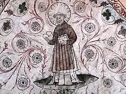 The church is decorated by a considerable number of 15th-century frescos depicting Biblical figures and stories. The unusually well crafted paintings by artists from Mälardalen include a picture in the nave vaulting of the Trinity in which God the Father holds his Son. Other paintings depict the Apostles, Nordic saints and the symbols of the four Evangelists.[1] The frescos in the tower room and in the south chapel are from the 17th century.