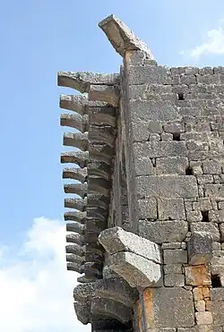 The ruins are composed of two houses and a cistern. The big house is a two or three-storey building with balconies and wide windows on the second floor.[1] The building was a villa rustica during the Byzantine Empire period. The stone walls, interior coving and blind vaults as well as corbels to support the balconies survive. But the ceiling and floor structures which were wooden have been demolished. There is a wide downspout which leads the rain water to a cistern at the back of the house. (In the Mediterranean area such cisterns were common during the Roman times). One of the balconies was a toilet room with sewage drain. There is also a smaller house at the back which was probably a service building of the villa.