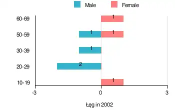 According to the 2002 Poland census, there were 7 people residing in Łęg village, of whom 57.1% were male and 42.9% were female. In the village, the population was spread out, with 14.3% under the age of 18, 42.8% from 18 to 44, 28.6% from 45 to 64, and 14.3% who were 65 years of age or older.[2]
