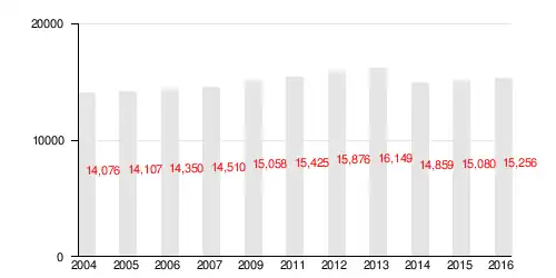 According to the Central Statistical Office data, the district's area is 5.42 square kilometres (2.09 square miles) and 14 859 people inhabit Łagiewniki-Borek Fałęcki.[1]