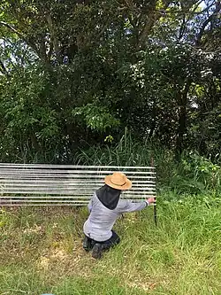 To prepare for the shimebata binding stage, 16–20 threads of about 16 meters in length, are grouped together, stretched between two posts, and covered in Igisu, a jelly-like paste made from seaweed. The threads must dry perfectly round for the shimebata stage, in order to create sharp kasuri.[13]