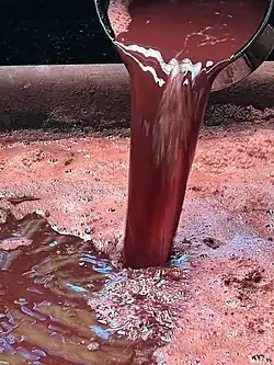 There are two main dyeing processes, one using a dye from the bark of the Techigi tree, and the other, mud. The Techigi tree is cut into chips and boiled down to a thick red liquid. The silk and cotton mats are first dyed in this dye turning them pink, and are then dyed repeatedly in the mud. The fabric goes from a light grey to a reddish brown, and finally to a rich, warm black. The tannin in the dye of the Techigi tree and the iron in the iron-rich mud react to create the black color, unique to Oshima Tsumugi.[15][16]