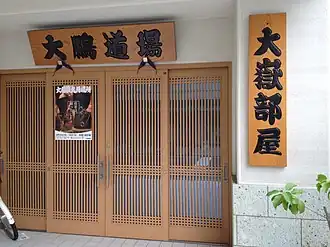 The entrance to the stable. The horizontal sign reads "Taihō-dōjō". The vertical sign reads "Ōtake-beya".