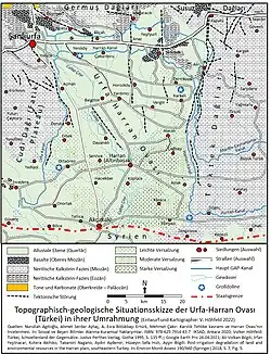 Most of Şanlıurfa province consists of Cenozoic formations.[7]: 191 Calcareous formations are predominant on the Fatik plateau, west of the Urfa-Harran plain, and in the Tektek Mountains to the east of the plain.[7]: 191–2 Among these are vast Eocene deposits north and west of Urfa, as well as younger Oligocene-Miocene deposits on the Tektek and lower Fatik plateaus.[7]: 191–2 There are also basalt deposits, dating from the Pliocene-Quaternary periods, just north of the city of Urfa itself.[7]: 191–2 These are associated with the Karacadağ Formation.[7]: 192 These basalt deposits are generally covered by just 5 to 10 cm of soil deposits; in some places, though, there is thick enough topsoil for agriculture.[7]: 192 On the Harran plain, more recent alluvial deposits from the Quaternary period predominate.[7]: 191, 3