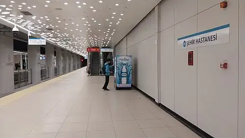 Şehir Hastanesi is an underground rapid transit station on the M3 line of the Istanbul Metro.[2] It is located on Olimpiyat Boulevard in Başakşehir. It was opened on 8 April 2023 with the Onurkent-Kayaşehir Merkez expansion built by the Ministry of Transport and Infrastructure.[3]