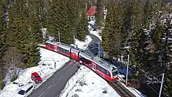 On 14 January 2021 Stadler delivered the first of five GTW 2/6 three-car electric multiple units for the line.[3] The new units, classed as 495.95, are capable of running in adhesive as well as rack mode, allowing them to run on the Tatra Electric Railway track as well.[4] The order also includes a universal locomotive class 485.95 and a snow plough, these were delivered on 22 January.[5] The fifth and final EMU was delivered in mid-July 2021.[6] On 2 August 2021 the units were approved for passenger operation.[7]