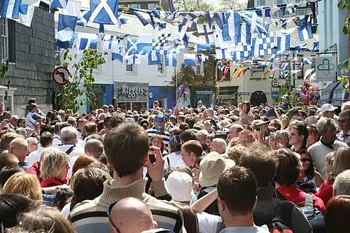 By the 1990s, the 'Obby 'Oss festival was a major attraction that drew large numbers of visitors to Lowennac/Padstow.[4] By that point, Hutton referred to it as "one of the most famous and most dramatic folk customs of modern Britain",[4] adding that it constituted "a tremendous reaffirmation of communal pride and solidarity in this small and normally quiet settlement".[4] The folklorist Doc Rowe, who has attended and documented the custom every year since 1963, goes further – describing 'Obby 'Oss Day as "a united proclamation – almost a 'clenched fist' in the face of time and outside influences... [it] can be seen as a communal pace-maker and, on Mayday, it recharges the community and the good fellowship of the people of Padstow."[11]