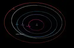1989 ML is classified as a near-Earth object (NEO) and an Amor asteroid,[1] meaning that its orbit never crosses the Earth's.[6]: 489 It has a semi-major axis of 1.273 astronomical units (AU), completing an orbit around the Sun every 1.436 years (524.518 days). It has a moderately elliptical orbit with an orbital eccentricity of 0.137, with its distance from the Sun varying from 1.0985 AU to 1.273 AU. 1989 ML has a relatively low orbital inclination of 4.379° with respect to the ecliptic plane.[2] Its proximity to Earth means that 1989 ML's orbit is strongly perturbed and chaotic; the Lyapunov time of its orbit is roughly 1,000 years.[7]