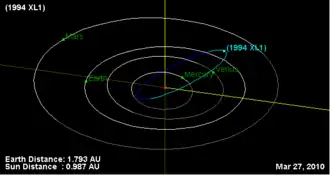 - ^ a b "JPL Close-Approach Data: (1994 XL1)" (2011-12-17 last obs (arc=17.03 years)). Retrieved 23 January 2013.