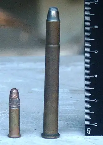 ![]() .25-25 Stevens (rt) with .22 long rifle for comparison | ||||||||||||