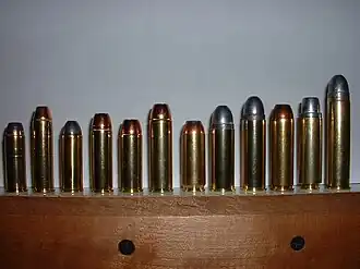 ![]() Left to Right (line by line) .44 Magnum, .445 Super Magnum, .45 Colt, .454 Casull, .480 Ruger, .475 Maximum, .50 Action Express, .500 Linebaugh, .500 Maximum, .500 S&W Magnum, .50 Beowulf, .50 Alaskan | ||||||||||||||||