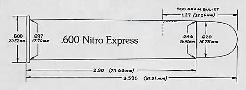 The .600 Nitro Express (15.7×76mmR) is a large bore Nitro Express rifle cartridge developed by W. J. Jeffery & Co. for the purpose of hunting large game.