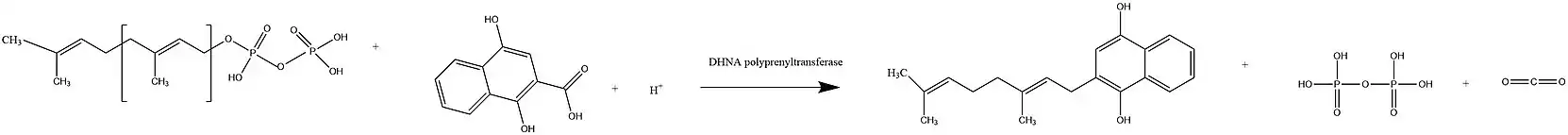 1-4-dihydroxy-2-napthoate polyprenyltransferase is the 8th out of 9 steps in the biosynthesis of menaquinone (Vitamin K), specifically demethylmenaquinol-9 within E. coli. Vitamin K is a cofactor vital for living and functions as one electron transporter in photosynthesis as a redox molecule.[4] The reactions this enzyme catalyzes works by taking the soluble bicyclic naphthalenoid compound DHNA and converting it into demethylmenaquinone-9 by attaching a 40 carbon side chain to DHNA. However, this enzyme is unique in the sense that it can put different lengths of carbon side chains onto DHNA to produce different demethylmenaquinols and menaquinols.[2]