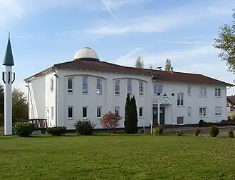 350 members,[56] 4.500 m2 plot for 350,000 Euro, 15 m high minaret.[57] foundation 26 Jun 2013[58] completed on 20 Oct 2019.50°32′24.4″N 9°41′14.7″E / 50.540111°N 9.687417°E / 50.540111; 9.687417 (Bait-ul-Hamid Mosque)[M 47]