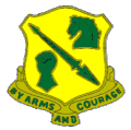 Just before the breakup of the regiment, the distinctive unit insignia and coat of arms of the regiment were approved on 1 March 1954. The distinctive unit insignia depicted a horse's head, lance, and gauntlet to symbolize cavalry, medieval armor, and the shock tactics of armored forces, respectively. Its green and yellow colors represented the armor branch. Below the shield of the insignia was the motto "By Arms and Courage." The regimental coat of arms was the shield of its distinctive unit insignia with the crest of the California Army National Guard above it.[4] The distinctive unit insignia continued to be used by the 134th Tank Battalion until 1960, after the latter was consolidated with other units to form the 185th Armor Regiment.[22][23]