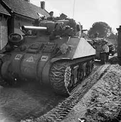 After a night move, and an unprecedented advance of 60 miles in one day, the division liberated Amiens on 1 September. The same day, it captured General Heinrich Eberbach, commander of the Wehrmacht's German 7th Army. Advancing to Lens, then Tournai, the division was then committed to the fight for Antwerp, which it liberated on 4 September. Two days later, it tried to establish a bridgehead over the Albert Canal, but the attempt, due to intense enemy fire, was not successful.[17] After this failure, 11th Armoured had to cross much further to the east, at Beringen.[18] The division was not directly committed to Operation Market Garden. Instead, it was tasked with securing the right flank of the operation. Attached to VIII Corps, it began moving on 18 September. Advancing in two columns, it managed to reach the US 101st Airborne Division at Nuenen, while on the 22nd, its engineers established a bridge over the Zuid-Willemsvaart canal. The division could then make an encircling move around Helmond, forcing the Germans to withdraw on 25 September.[19]