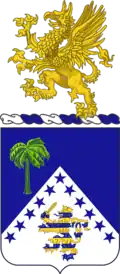 The shield is blue and white to difference it from the former coat of arms of the 125th Infantry Regiment, parent organization, now redesignated for the 425th Infantry Regiment, Michigan National Guard. The palm tree, eleven mullets (stars), and the crowned lion–all charges taken from this coat of arms–are applicable to the organization's historical background. The palm tree represents service at Santiago during the Spanish–American War, and the eleven mullets are for Civil War service. The crowned lion taken from the Arms of Hesse symbolize the organization's entrance into Germany during World War I.[2]