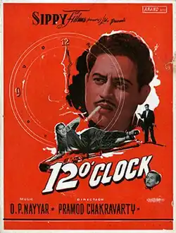 12 O'Clock is a 1958 Bollywood Thriller and Mystery film starring Guru Dutt, Waheeda Rehman and Rehman.[1] It was produced by G.P. Sippy and directed by Pramod Chakravorty.[2][3] It was listed in Best Bollywood Noirs of 1950s by Filmfare, citing, While Guru Dutt is as effective as ever and Waheeda looks suitably grief-stricken and confused, the film belongs to Rehman, who plays Bani's manipulative brother-in-law to perfection.[4]