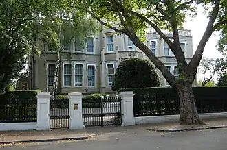 The house is built using "buff-coloured bricks with Bath stone dressings" and has a symmetrical front facade.[3] The house has two principal stories, a ground level "part storey" (which originally contained the female servants' quarters), and a 14-foot high fireproof basement which extended under the courtyard to the rear of the house.[3] The front entrance of the house is a three-storey tower, originally topped with a bell-turret demolished in the 1920s.[3] Above the front entrance is an oriel window and quatrefoil parapet.[3] To the south, the house has a conservatory.[3]