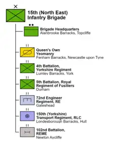 15th (North East) Brigade was a Regional Brigade responsible for the recruiting of soldiers and Officers for the Regular and Territorial Army. It trained the Territorial Army for operations, provided a command and control focus for all military support to civilian authorities during civil emergencies e.g. flooding and was responsible for providing the "Firm Base" to the Regular Army within its area. The brigade had its headquarters at Imphal Barracks in York and included the following units:[5]
