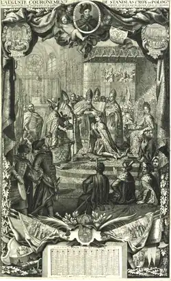 On July 12, 1704, a small group of szlachta, gathered in a Swedish army camp near Warsaw, declared Leszczyński the new King. The election was not confirmed by Primate Radziejowski, but by Bishop of Poznań Mikołaj Święcicki, which was against the rules. On October 4, 1704, Leszczyński was crowned by Archbishop of Lwów, Konstanty Józef Zieliński. The coronation took place at Warsaw’s St. John's Archcathedral.