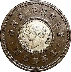 The 1844 Victoria One Penny Model was a model coin issued by Birmingham medallist Joseph Moore (1817–1892) between 1844 and 1848, during a period in which the British Government were considering the notion of replacing the heavy copper coinage then in use.