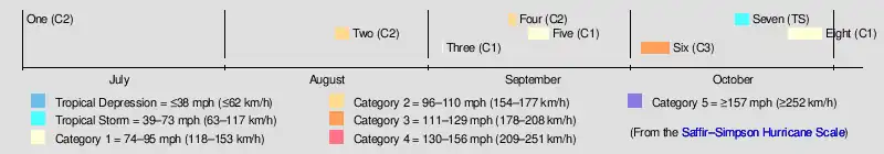 The season's activity was reflected with an accumulated cyclone energy (ACE) rating of 56.[1] ACE is, broadly speaking, a measure of the power of the hurricane multiplied by the length of time it existed, so storms that last a long time, as well as particularly strong hurricanes, have high ACEs. It is only calculated for full advisories on tropical systems at or exceeding 39 mph (63 km/h), which is tropical storm strength.[3]