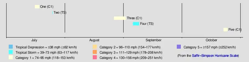 The 1864 Atlantic hurricane season was the third consecutive Atlantic hurricane season with no hurricane landfall in the United States – the longest period on record.[1] Of the five known 1864 cyclones, four were first documented in 1995 by Jose Fernandez-Partagas and Henry Diaz.[2] In the absence of modern satellite and other remote-sensing technologies, only storms that affected populated land areas or encountered ships at sea were recorded, so the actual total could be higher. An undercount bias of zero to six tropical cyclones per year between 1851 and 1885 has been estimated.[3] The first system was initially observed offshore the Southeastern United States on July 16. It peaked as a Category 1 hurricane on the modern day Saffir–Simpson hurricane wind scale. Moving rapidly northeastward, the storm was last noted well east of Newfoundland on July 18.
