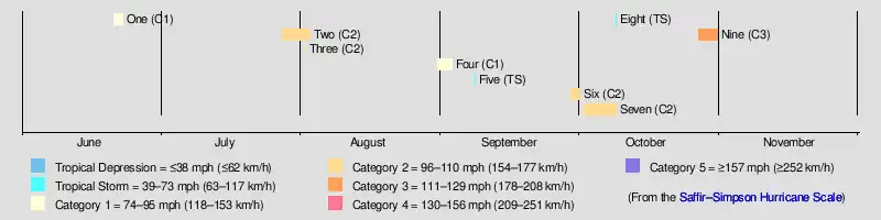 | Two | July 28–August 3 | Category 2 hurricane | 105 (165) | 969 | East Coast of the United States, Atlantic Canada | Unknown | 13 | [10][11] | ||