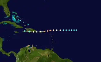 On October 27, the storm developed northeast of the Lesser Antilles usually late into the season,[2] in which the mail steamer Principe Alfonso skillfully avoided the storm. This tropical storm continued westward before intensifying to a hurricane the next day. It then reached category 3 status on October 29, before striking Sombrero, Anguilla near or at peak intensity. After 8 am local, a barometric pressure of 28.65 inches of mercury (97.0 kPa) accompanied by a half-hour calm occurred. The wind then shifted to a violent easterly until 11 am and then diminished through 1 pm. The hurricane reached its peak intensity of 125 miles per hour (201 km/h) at 1200 UTC near the island.