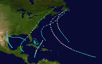The 1874 Atlantic hurricane season featured the first hurricane to be recorded on a weather map by the United States Signal Service (the present-day National Weather Service). It was a relatively inactive season, in which seven tropical cyclones developed. Four storms intensified into hurricanes, but none attained major hurricane status.[nb 1] However, in the absence of modern satellite and other remote-sensing technologies, only storms that affected populated land areas or encountered ships at sea were recorded, so the actual total could be higher. An undercount bias of zero to six tropical cyclones per year between 1851 and 1885 and zero to four per year between 1886 and 1910 has been estimated.[2]