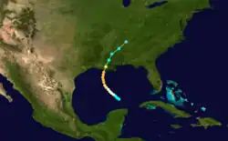 Benito Viñes documented this storm over the northwestern Caribbean as early as August 19.[22] Moving west-northwestward, the cyclone intensified into a hurricane on at 00:00 UTC on August 20,[3] according to reports from the ship Elvina.[5] About 12 hours later, the hurricane made landfall in Mexico near Felipe Carrillo Puerto, Quintana Roo, with winds of 80 mph (130 km/h). The hurricane weakened to a tropical storm late on August 20, but re-strengthened into a hurricane in the Gulf of Mexico the next day. Turning north-northwestward, the cyclone strengthened into a Category 2 hurricane on August 22, and made landfall near present-day High Island, Texas, early on August 23.[3] Based on a barometric pressure of 988 mbar (29.2 inHg) at Shreveport, Louisiana, the hurricane is estimated to have possessed sustained winds of 105 mph (165 km/h) and a barometric pressure of 964 mbar (28.5 inHg).[5] The system weakened to a tropical storm later on August 23 and then to a tropical depression early on August 24, before dissipating over Kentucky several hours later.[3]