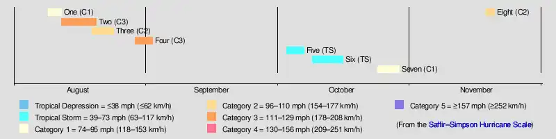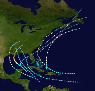 | Two | August 13–20 | Category 3 hurricane | 115 (185) | 971 | Lesser Antilles, Turks and Caicos Islands, the Bahamas, East Coast of the United States (North Carolina and Massachusetts), Atlantic Canada (Nova Scotia and Newfoundland) | Unknown | 54 | [8][9] | ||