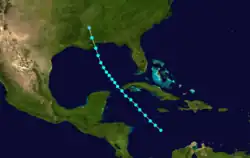 Similar to the path constructed by meteorologist C. J. Neumann in 1993,[13] the official track begins on October 9 about 240 mi (385 km) east-northeast of Barbados. Moving west-northwestward, the storm passed through the Lesser Antilles on the next day, striking Martinique before entering the Caribbean. On October 12, the cyclone struck or moved very close to Jamaica with winds of 60 mph (95 km/h). Shortly after turning north-northwestward on October 14, the system made landfall in Cuba on Isla de la Juventud and then near La Coloma in Pinar del Río Province. The storm entered the Gulf of Mexico and likely underwent little change in intensity before making its final landfall near Fort Walton Beach, Florida, around 08:00 UTC on October 16. Several hours later, the cyclone dissipated over central Alabama.[3]