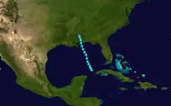 Observations suggest the presence of a tropical storm over the southern Gulf of Mexico on August 1.[8] The storm moved generally north-northwestward across the Gulf of Mexico before striking Dauphin Island, Alabama, and then near the Alabama-Mississippi state line on August 3 with winds of 60 mph (95 km/h).[5] An assessment of the storm by the Atlantic hurricane reanalysis project estimated that it weakened to a tropical depression early the following day, shortly before dissipating over east-central Mississippi.[6]