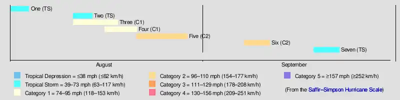 - ^ The storm category color indicates the intensity of the hurricane when landfalling in the U.S.