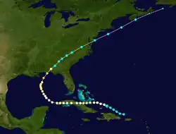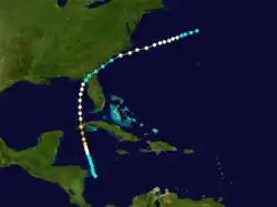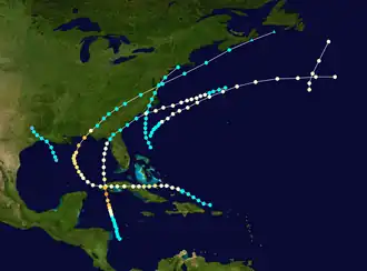 This storm was first observed on October 5 over the southwestern Caribbean.[26] Trekking slowly north-northwestward, the cyclone is estimated to have intensified into a hurricane on October 7,[7] one day before the barks Tamora and Sadie reported hurricane conditions.[26] The storm strengthened into a major hurricane later on October 8,[7] before making landfall in Cuba early the next day near Boca de Galafre in Pinar del Río Province.[7] A reanalysis by meteorologist Ramón Pérez Suárez estimated sustained winds at 140 mph (220 km/h), making it a Category 4 hurricane.[4] The cyclone weakened greatly over the island, quickly falling to Category 1 status and never recovering while moving northward over the Gulf of Mexico. It made landfall near Horseshoe Beach, Florida, with winds of 80 mph (130 km/h) at 04:00 UTC on October 11 and weakened to a tropical storm a few hours later while moving northeastward. The storm emerged into the Atlantic from the coast of Georgia late on October 11 and re-strengthened into a hurricane by the following day. However, the cyclone weakened back to a tropical storm on October 15 and was last noted several hours later about 350 mi (560 km) southeast of Nantucket, Massachusetts.[7] Chenoweth extended the duration of the cyclone until October 18, with it moving erratically offshore the northeastern United States for a few days.[6]