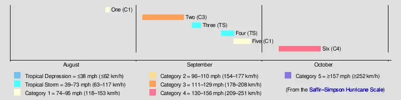 | Six | October 5–15 | Category 4 hurricane | 140 (220) | ≤975 | Cuba, Southeastern United States (Florida) | >$5,000 | 140 | [10][14] | ||