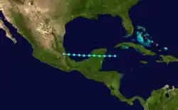 Based on information from the Monthly Weather Review, a tropical storm was first noted over the northwestern Caribbean on October 6.[44] Moving nearly due west, the system made landfall in Mexico near Punta Allen, Quintana Roo, with winds of 60 mph (95 km/h) early the next day. After weakening slightly, the storm emerged into the Bay of Campeche late on October 7 and soon re-strengthened back to sustained winds of 60 mph (95 km/h). Late on October 8, the cyclone struck Mexico again near Nautla, Veracruz, before rapidly dissipated by early on October 9.[7] The 2014 study by Chenoweth proposes a much more southerly track, with the storm instead striking Belize or Guatemala as a minimal hurricane before dissipating over the latter on October 9.[6]