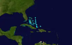 The Atlantic hurricane database (HURDAT) officially recognizes that 19 tropical cyclones formed during the 1887 season, 11 of which strengthened into a hurricane. Although both numbers set a record at the time, this activity has been surpassed or equaled many times, first in the 1933 season, which featured 20 tropical storms, while tying for the amount of hurricanes. Later, the 1969 season became the first to exceed the 1887 season's number of hurricanes, with 12. Currently, the seasonal records for most tropical storms is 30 and the most hurricanes is 15, set in 2020 and 2005, respectively.[1] Five storms existed outside the modern-day boundaries of an Atlantic hurricane season – June 1 to November 30 – which is also a record.[4]
